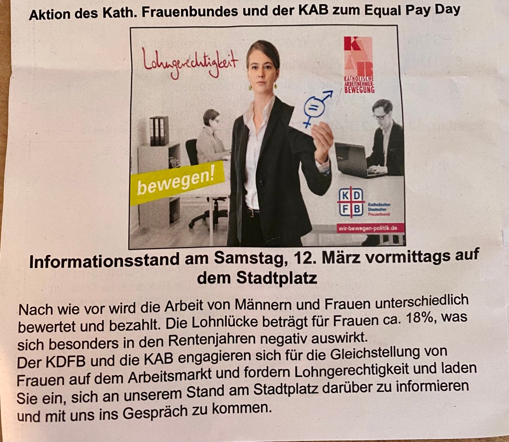 Samstag, den 12.03.2022 von 10:00 Uhr bis 12:00 Uhr einen Infostand zum Thema „Lohngerechtigkeit“ auf dem Penzberger Stadtplatz.